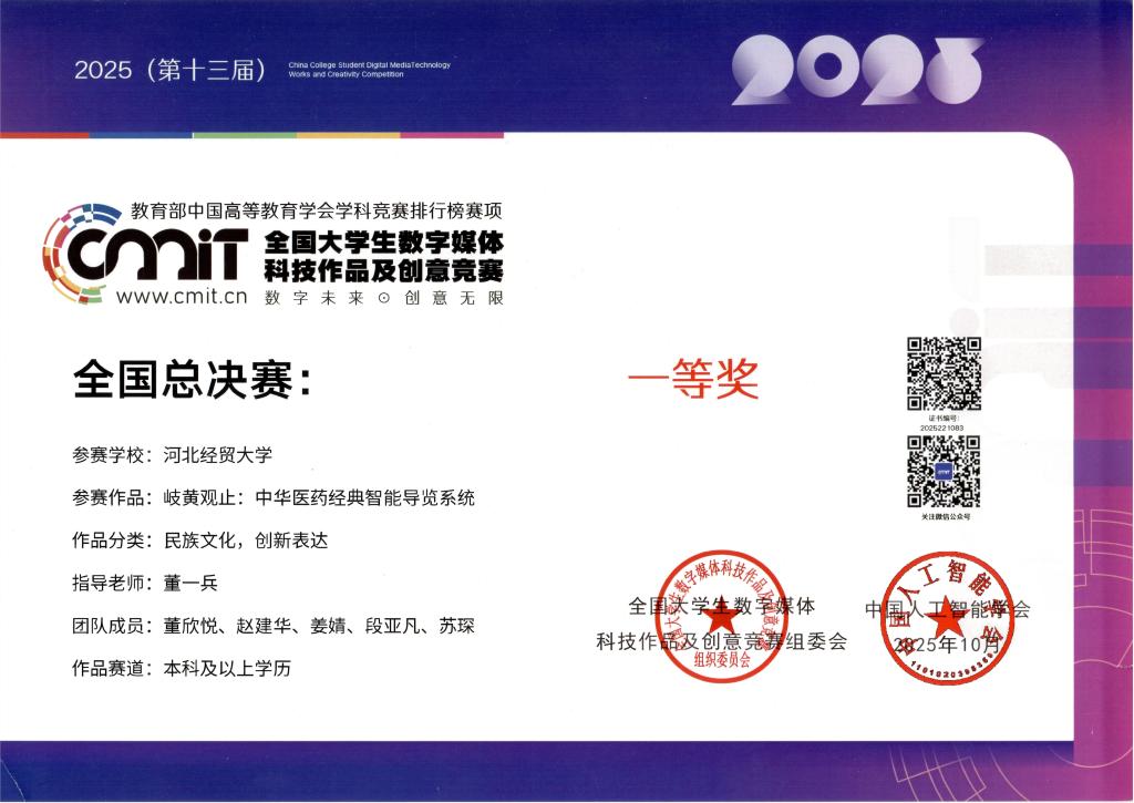 全国大学生数字媒体科技作品及创意竞赛是由中国人工智能学会主办的全国性高水平学科竞赛,创办于2013年,旨在推动智能科技与数字创意的融合,提升大学生创新实践能力。本次全国总决赛在哈尔滨举行。我集团代表队携作品《岐黄纪年:中华医药经典智能导览系统》参赛,参与“民族文化,创新表达”类别全国总决赛的角逐。经过现场答辩、专家评审、作品复议等环节的激烈争夺,我集团作品最终取得了国赛一等奖的优异成绩。