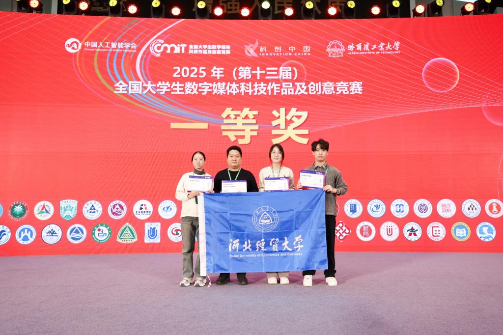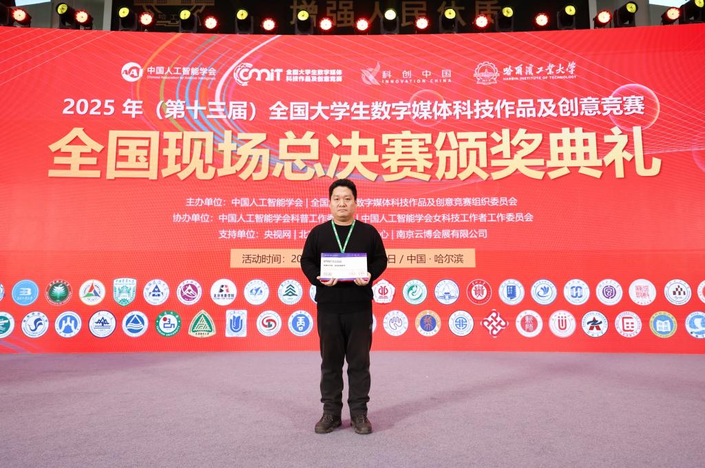 日前,我集团学生董欣悦、赵建华、姜婧,段亚凡(研究生)、苏琛(研究生)及指导教师董一兵组成的参赛队伍,在2025年第十三届全国大学生数字媒体科技作品及创意竞赛全国总决赛中荣获一等奖,指导教师董一兵荣获“优秀指导教师”称号。