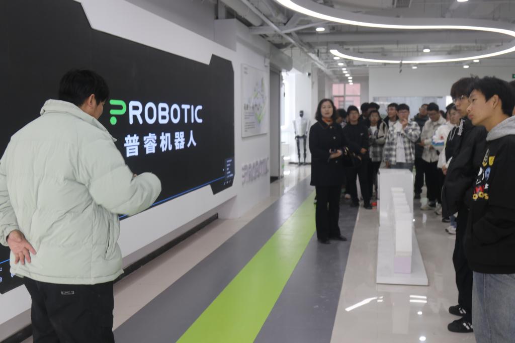 首站来到普睿机器人展厅,师生们聚焦工业协作机器人与服务机器人核心技术,跟随技术人员参观了协作机器人、人形机器人等智能产品,对课本里的“运动控制算法”有了具象认知。学生们积极与相关技术人员交流技术疑问,现场学习氛围浓厚。